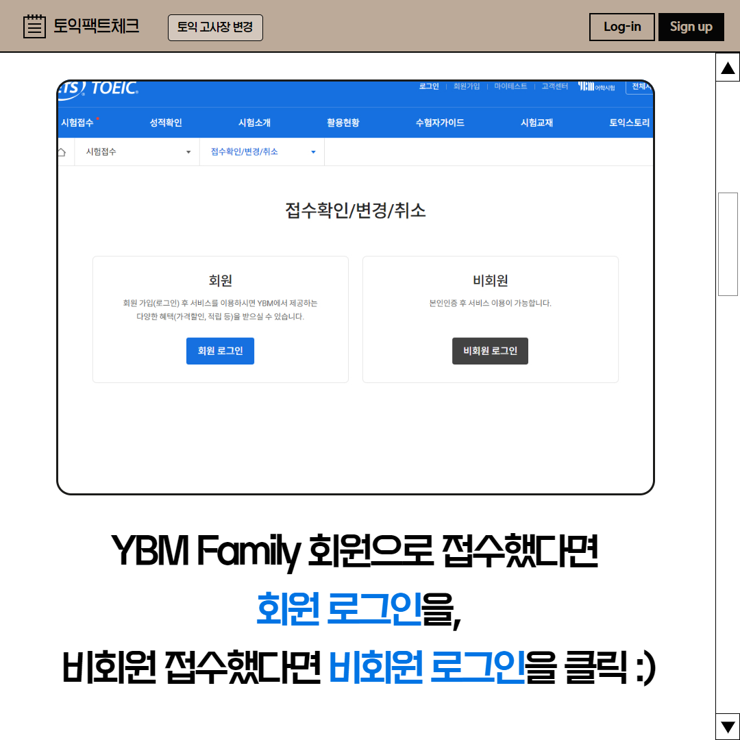 토익 시험 접수 시, YBM Family 회원으로 접수했다면 회원 로그인을 클릭해주세요.