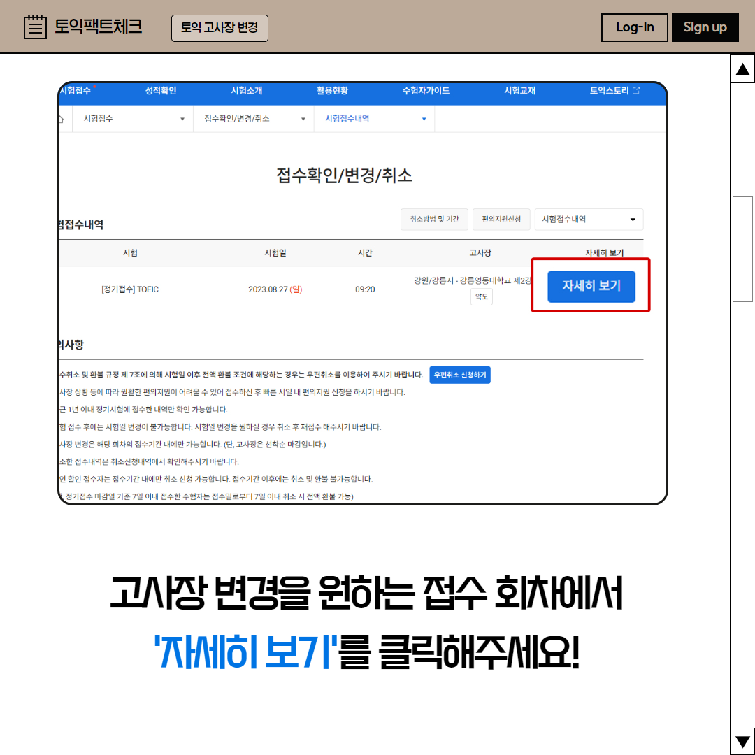 고사장 변경을 원하는 접수 회차에서, '자세히 보기'를 클릭해주세요!