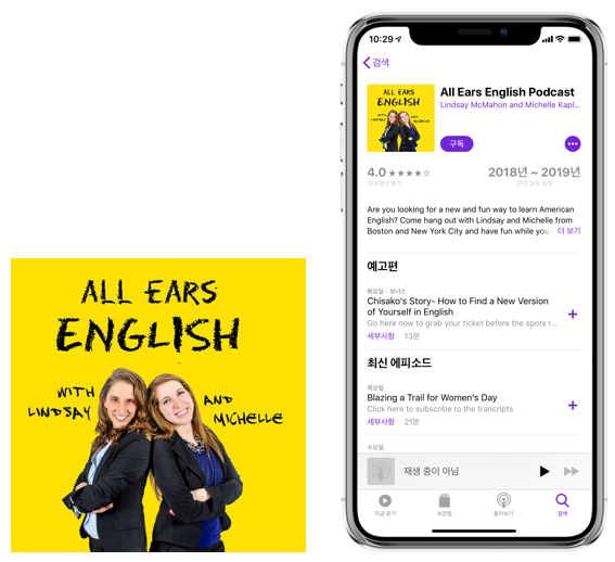 Culips가 초보자를 위해 제작된 정제된 느낌의 팟캐스트라면, All Ears English는 에너지가 넘치는 두 미국인 Michelle과 Lindsay가 즐겁게 대화하는 생활영어 느낌의 팟캐스트입니다. 자연스럽게 대화하는 속도로 진행되다 보니 조금 어려울 수 있습니다.