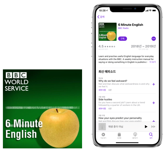 영국의 대표 방송사 BBC에서 제작한 'BBC 6분 영어'! 짧은 분량과 영국 발음으로 듣기 연습을 할 수 있습니다. 학습을 목적으로 만들어진 콘텐츠라 일상 대화보다는 확실하고 또렷하게 들을 수 있어요.