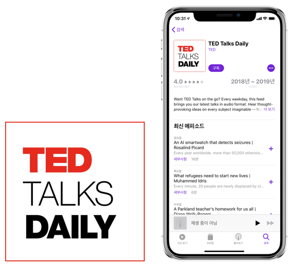 강연으로 잘 알려진 TED, 알고 계시죠? TED 강연 중 오디오로 들을 수 있도록 제작해 팟캐스트로 제공하고 있습니다. 강연자가 다양해 각국의 영어 발음을 골고루 접해볼 수 있는 장점이 있지만 다양한 주제만큼 난이도가 높아 초급자에게는 어려울 수 있답니다.