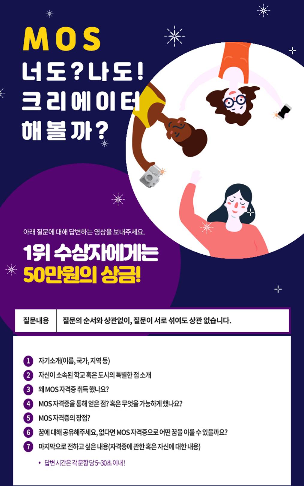 YBM MOS 사무국에서 MOS와 여러분의 이야기를 듣고자 합니다. MOS와 관련된 일곱 가지 질문에 대한 답을 영상으로 만들어 주세요. 질문의 순서와 상관없이 가장 창의적으로 답변 영상을 촬영한 분들께 상금 50만 원 등 다양한 경품을 드립니다.