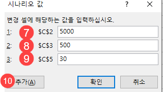 11. 시나리오 이름에 “최상의 경우”를 입력합니다. 12.변경 셀에 “C2, C3, C5”가 자동으로 입력되어 있는지 확인합니다. 13. [확인]을 클릭합니다.