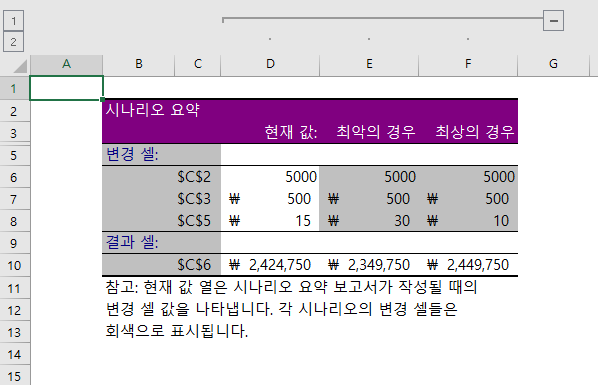 [최악의 경우], [최상의 경우] 시나리오가 요약 표로 나타납니다.