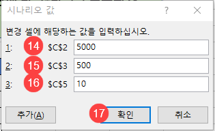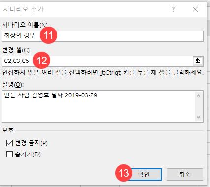 11. 시나리오 이름에 “최상의 경우”를 입력합니다. 12.변경 셀에 “C2, C3, C5”가 자동으로 입력되어 있는지 확인합니다. 13. [확인]을 클릭합니다.