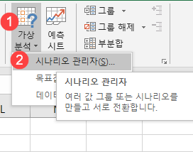 [데이터] > [예측] > [가상분석] > 시나리오 관리자를 클릭합니다.