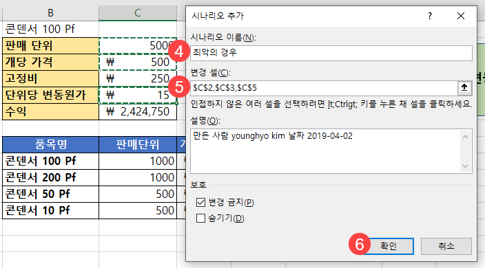 (주)일렉트릭 마트는 전기전자 부품들을 수입해서 온라인 쇼핑몰에서 판매하는 도매업체입니다. 판매하는 품목 중 “콘덴서 100 Pf”라는 상품이 있습니다. 시나리오를 만들어서 이 상품의 변동원가가 최악(인상)일 때와 최상(인하)일 때 수익에 어떤 변화가 있는지 알아보겠습니다.