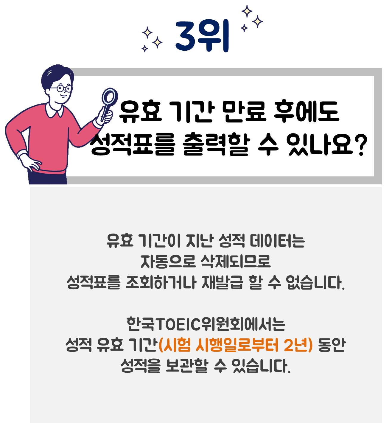 '유효기간 만료 후에도 성적표를 출력할 수 있나요?'가 3위를 차지했는데요. 한국TOEIC위원회는 성적 유효 기간 동안(시험 시행 일로부터 2년)만 성적을 보관하고, 유효 기간이 지난 성적 관련 자료는 성적 조회 및 성적표 재발급이 불가합니다.