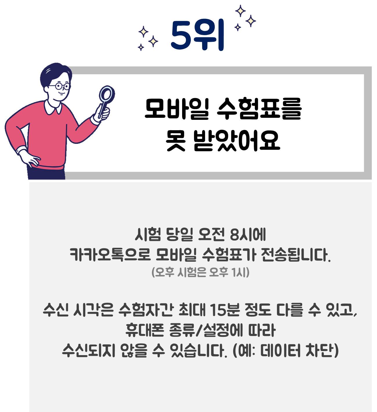 마지막으로 5위, '모바일 수험표를 못 받았어요' 질문입니다! 오전 시험의 경우 시험 당일 오전 8시에, 오후 시험의 경우 오후 1시에 카카오톡으로 모바일 수험표가 전송됩니다. 단! 데이터 차단 등 휴대폰 종류와 설정에 따라 모바일 수험표가 수신되지 않을 수 있으니 이 점 주의해주세요~!