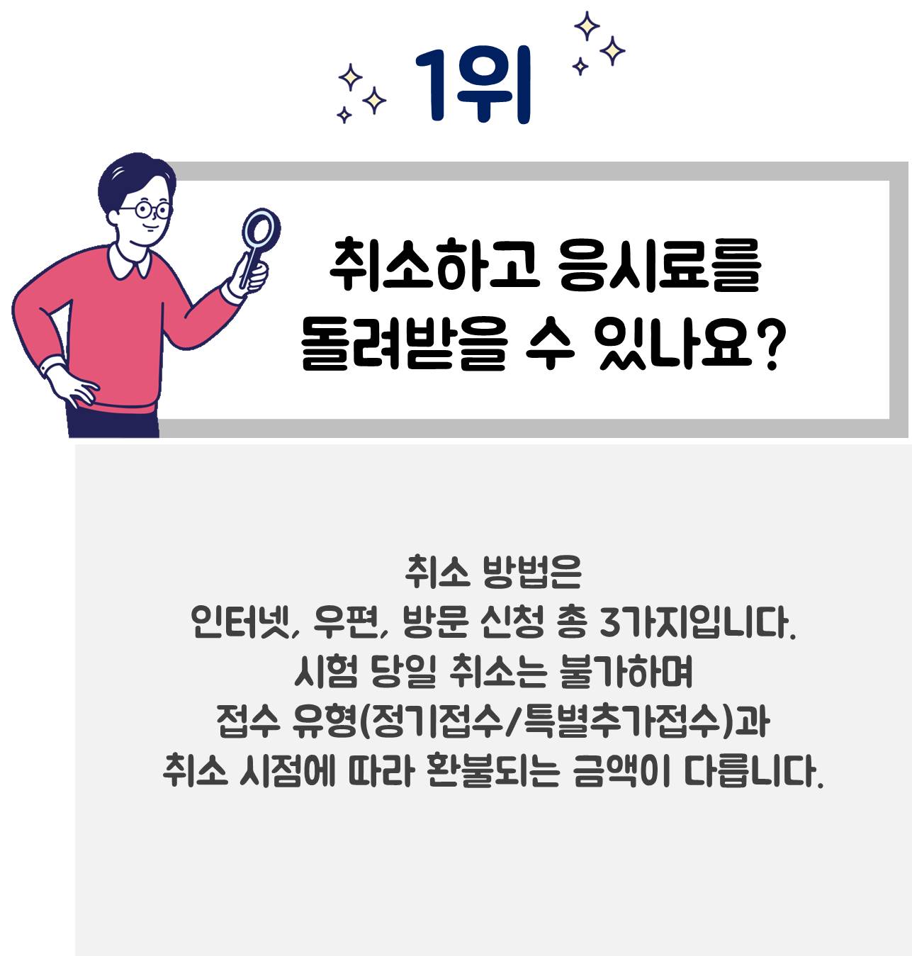 먼저 1위는 '취소하고 응시료를 돌려받을 수 있나요?'가 차지했는데요. 접수 유형과 취소 시점에 따라서 환불되는 금액이 다릅니다.