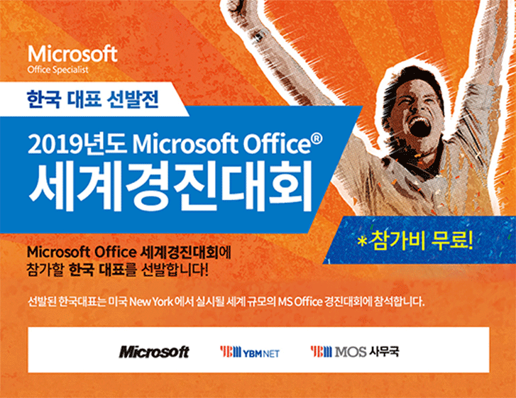 'Microsoft Office 세계경진대회 한국 대표 선발전'은 지난 2001년부터 YBM MOS 사무국과 YBMSISA.COM이 주최해온 대회로, 실무 현장 및 취업 준비생들에게 기본이 되는 MS Office 활용 능력을 경연하는 축제의 장인데요. 2019년 7월 28일~31일 미국 New York에서 OA 능력을 경합하는 Microsoft 세계경진대회에 출전할 한국 대표를 선발하는 대회이기도 합니다.