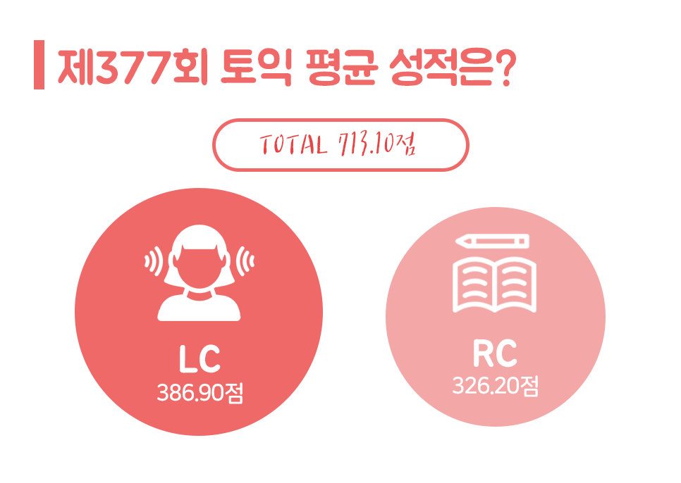 377회 평균 성적은 713.10점으로 지난 3월 31일 시험보다 무려 36.21점 상승하였는데요. 지난 회차에 비해 엄청난 상승세를 보였을 뿐 아니라 올해 시험 중 최고의 평균 성적을 기록하였습니다! 부문별로 보면 LC 평균 점수는 386.90, RC 326.20점으로 지난 376회보다 각각 12.75점, 23.45점 상승하였고요