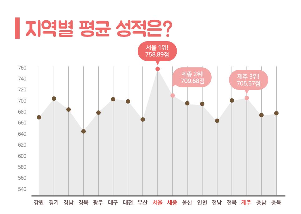 이번 회차 지역별 평균 성적에서도 역시 '서울'의 평균 성적이 가장 높았는데요. 저번 시험보다 37.22점 상승한 758.89점으로 '서울'이 선두를 달렸습니다. 기존 순위와 달리 '세종'이 709.68점으로 2위를 차지하였고 4위인 '경기'와 0.45점의 아슬아슬한 차이로 뉴페이스 '제주'가 705.57점을 기록하며 3위를 차지했습니다.