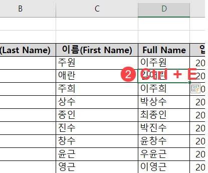 2. 셀 포인터가 D5셀에 있는 상태에서 빠른 채우기의 단축키인 CTRL+E 키를 누릅니다. “Full Name”열 전체에 이름이 자동으로 채워지는 것을 알 수 있습니다.
