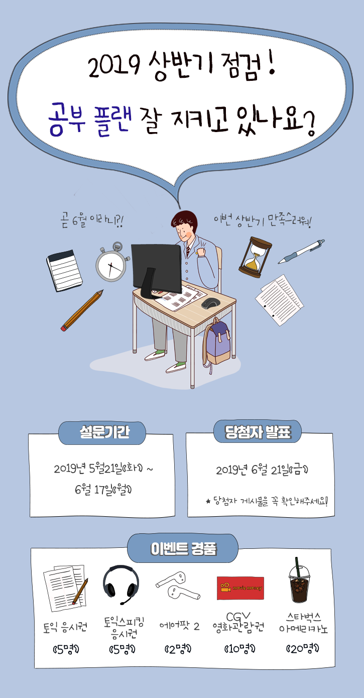 어느새 시간이 쏜살같이 흘러 5월이 되었습니다. 2019년 상반기도 다음 달이면 마무리되는데요. 여러분들의 상반기 공부 플랜도 점검하고 앞으로의 공부 플랜을 알아보고자 <토익스토리>에서 설문조사 이벤트를 준비했습니다.