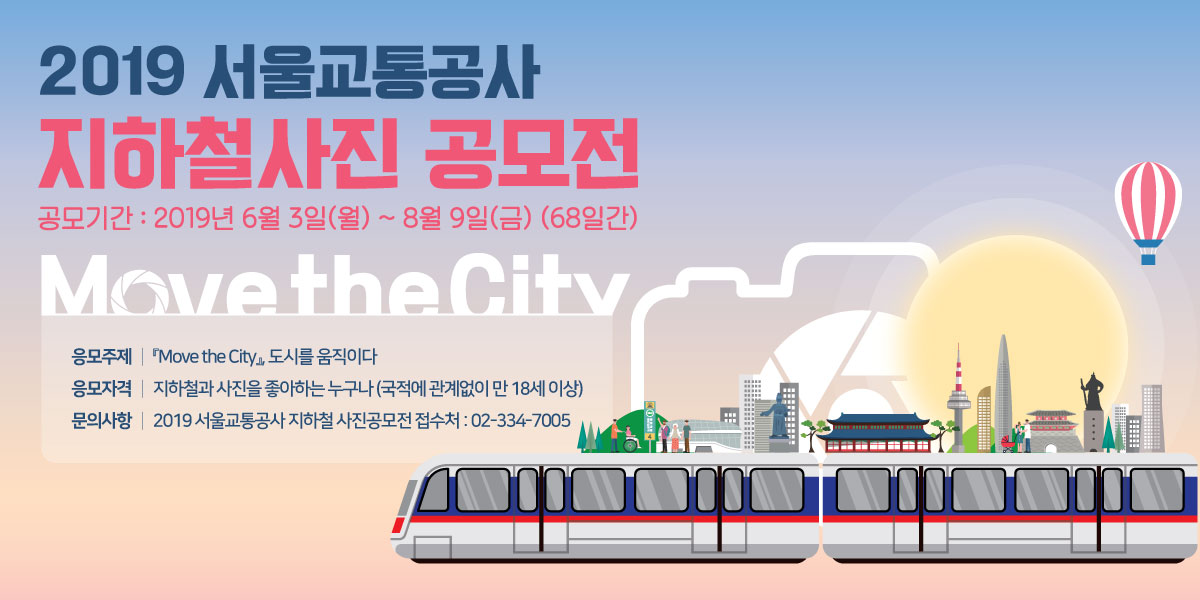 '사진 좀 찍는다'하시는 분들은 마지막으로 소개해드릴 '2019 서울교통공사 지하철 사진 공모전'을 주목해주세요! 응모 주제는 '『Move the City』 도시를 움직이다'인데요. 사람을 움직이고 도시를 움직이는 지하철을 소재로 다양하고 생동감 있는 서울교통공사의 모습을 조화롭게 잘 드러낸 작품, 공사 슬로건인 'Move the City'를 잘 표현하고 예술적 가치가 있는 작품, 지하철 1~8호선, 9호선(언주~중앙보훈병원역)만이 가지고 있는 매력을 잘 나타낸 작품을 제출해주시면 됩니다. 공모전 접수 기간은 8월 9일까지이니 일정 꼼꼼히 체크해주세요~