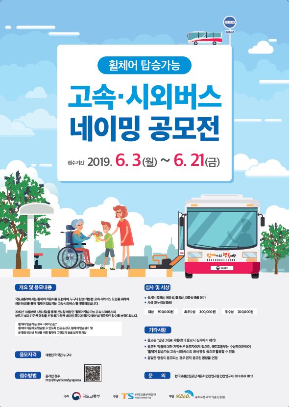 먼저 6월 21일까지 참여가 가능한 '휠체어 탑승 가능 고속·시외버스 네이밍 공모전'입니다. 국토교통부에서 2019년 10월부터 시범사업을 통해 선보일 예정인 '휠체어 탑승 가능 고속·시외버스'에 부르기 쉽고 친근한 명칭을 여러분이 지어주세요~ 동일한 명칭이 응모되는 경우 먼저 응모된 명칭을 인정한다고 하니 서둘러서 접수해주시는 것 잊지 마세요~!