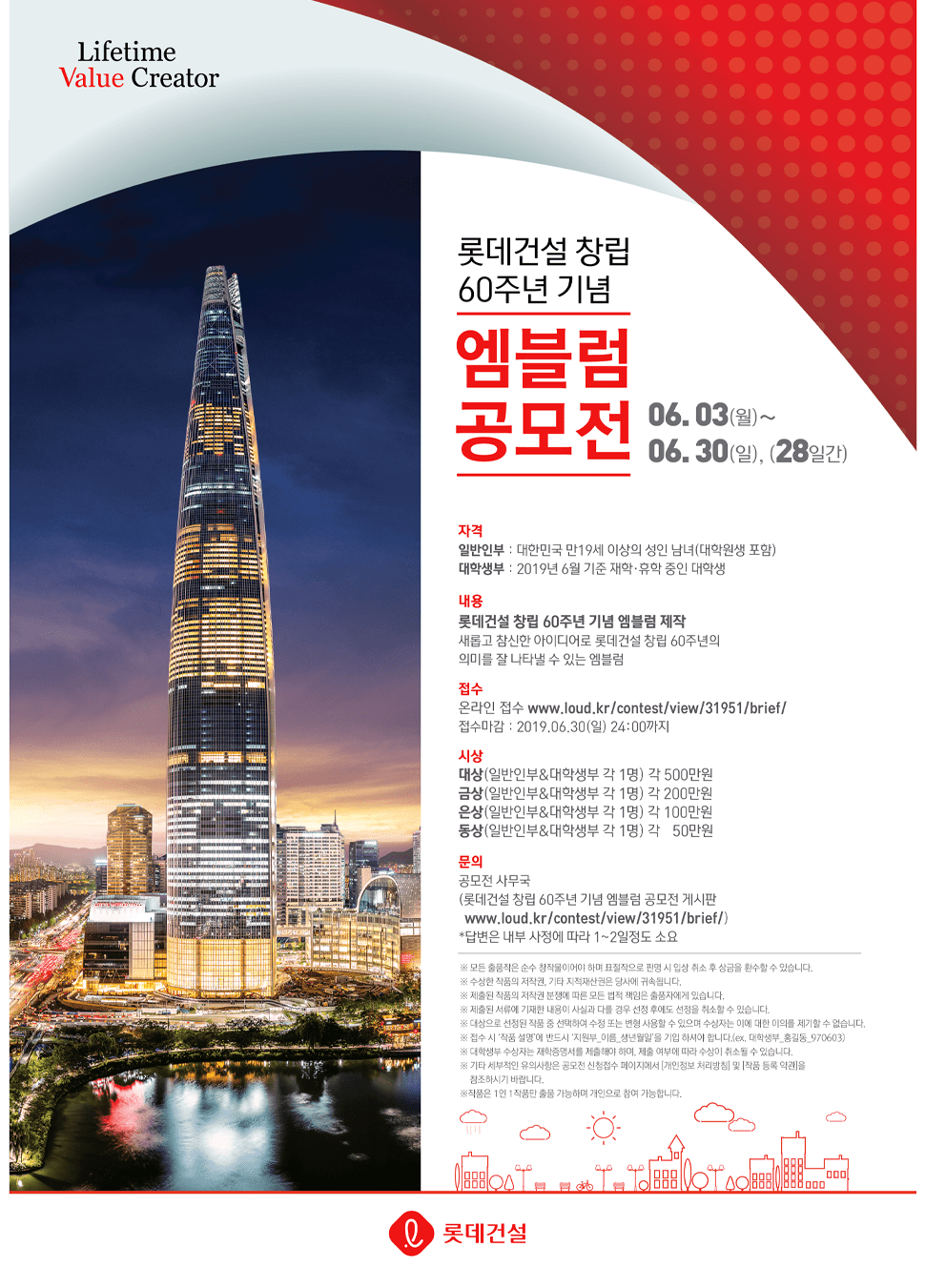 롯데건설이 창립 60주년을 맞아 '엠블럼 공모전'을 6월 30일까지 진행합니다. 새롭고 참신한 아이디어로 롯데건설 창립 60주년의 의미를 잘 나타낼 수 있는 엠블럼을 제작하는 것이 공모전 내용인데요. 1인 1작품만 출품 가능하며 개인으로도 참여가 가능합니다. 일반인부와 대학생부를 나눠서 진행되는 점 참고해주세요!