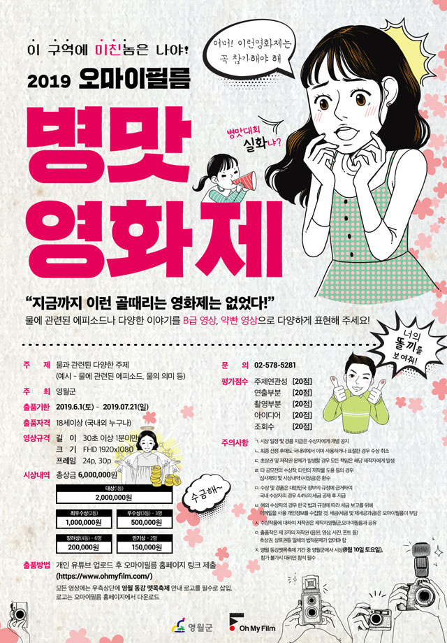 식상한 공모전은 가라! 잠자고 있던 여러분의 B급 감성을 뿜뿜! 뽐낼 수 있는 공모전이 준비되어 있는데요. 바로 영월군에서 주최하는 '2019 병맛 영상 공모전'입니다. 물에 관련한 에피소드나 다양한 이야기를 B급 영상, 약빤 영상으로 다양하게 표현해주면 되는데요. 출품 방법은 7월 21일까지 개인 유튜브에 업로드 후 오마이필름 홈페이지에 링크를 제출하면 됩니다. 모든 영상에는 우측 상단에 '영월 동강 뗏목축제' 안내 로고를 필수로 삽입해야 하는 점 꼭! 기억해주세요~