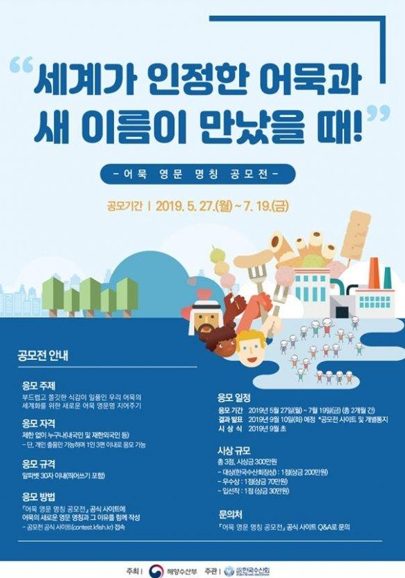 우리들의 영원한 국민간식 어묵! 해양수산부에서 어묵의 세계화를 위해 '어묵 영문 명칭 공모전'을 진행한다고 합니다. 응모 방법은 '어묵 영문 명칭 공모전' 공식 사이트에 어묵의 새로운 영어 명칭과 그 이유를 함께 작성해주면 되는데요. 띄어쓰기를 포함하여 알파벳 30자 이내여야 하고요. 접수 기간은 7월 19일까지이니 일정 확인하시고 여러분의 창의력을 발휘해주세요~