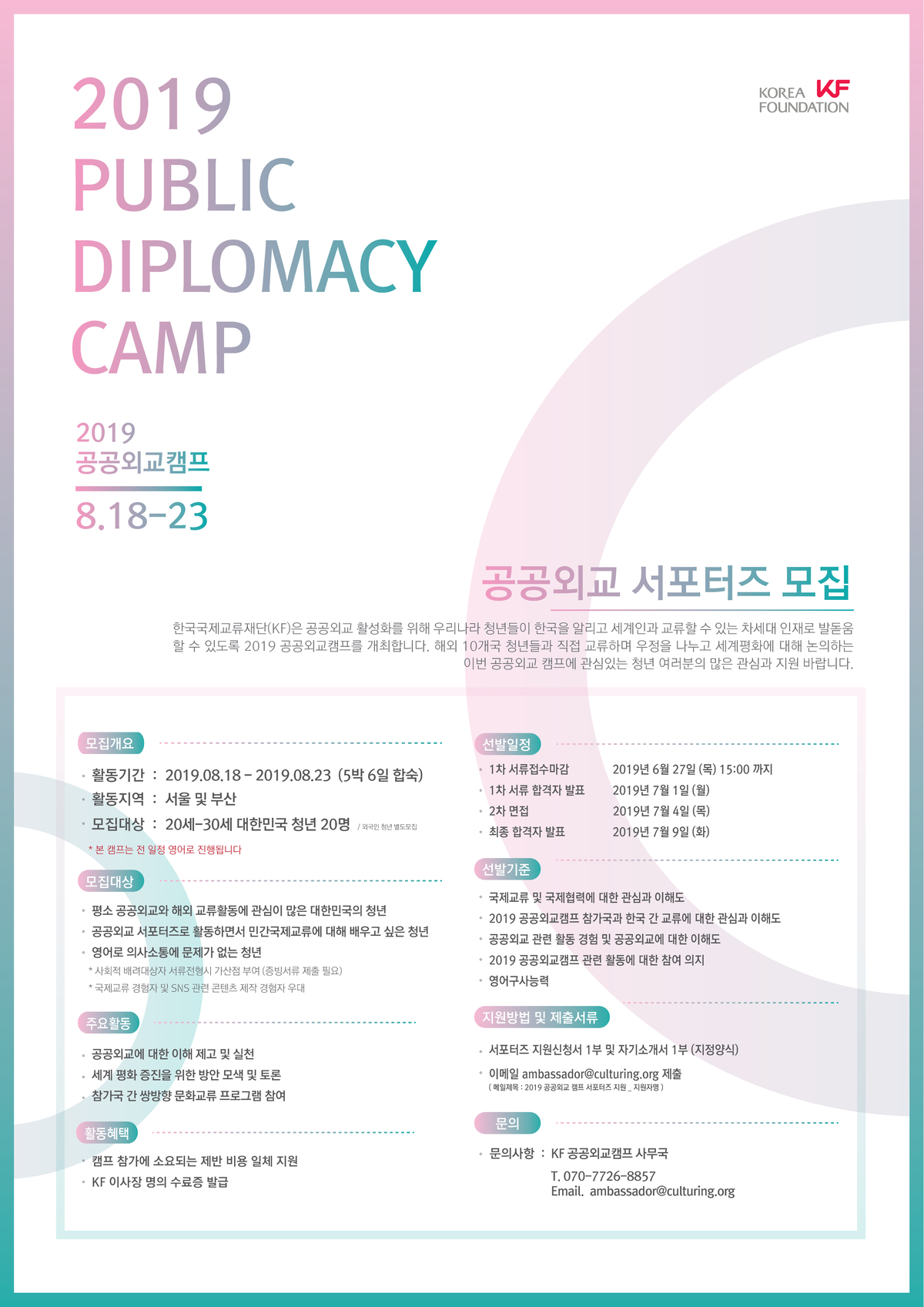 마지막으로 한국국제교류재단에서 주최하는 '2019 Public Diplomacy Camp KF 공공외교 서포터즈'를 소개해드릴게요! 5박 6일동안 합숙하며 공공외교에 대한 이해 제고 및 실천, 세계 평화 증진을 위한 방안 모색 및 토론, 참가국 간 쌍방향 문화교류 프로그램 등을 진행하는 활동인데요. 본 캠프는 전 일정 영어로 진행되기 때문에 영어로 의사소통하는데 문제가 없는 청년이어야 합니다. 공공외교에 대해 견문을 넓힐 수 있을 뿐 아니라 영어실력을 한층 더 UP! 시킬 수 있는 절호의 기회이니 도전해보세요!