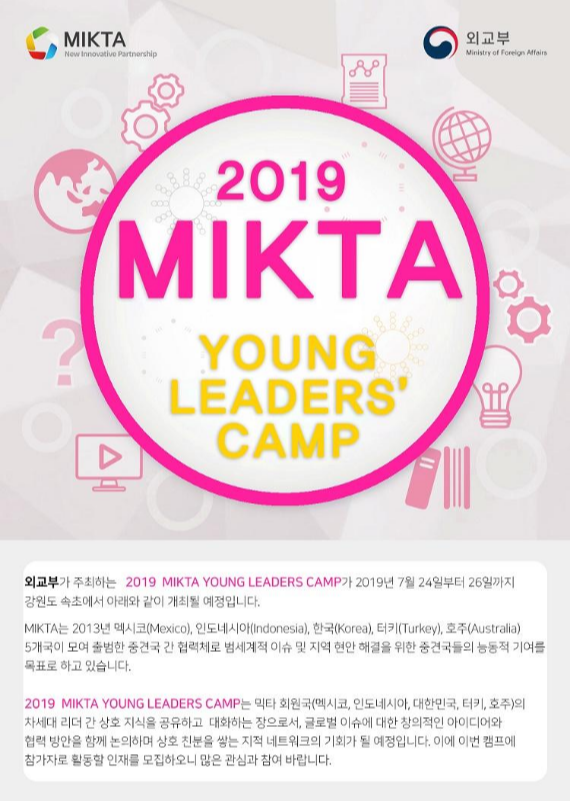 외교부에서 주최하는 '2019 MIKTA YOUNG LEADERS' CAMP'가 7월 24일부터 7월 26일까지 3일간 강원도 속초에서 진행됩니다. 믹타(MIKTA)는 멕시코, 인도네시아, 한국, 터키, 호주 5개국이 모여서 출범한 중견국 간 협력체이며 범세계적 이슈 및 지역 현안 해결을 위한 중견국들의 능동적인 기여를 목표로 하는데요.