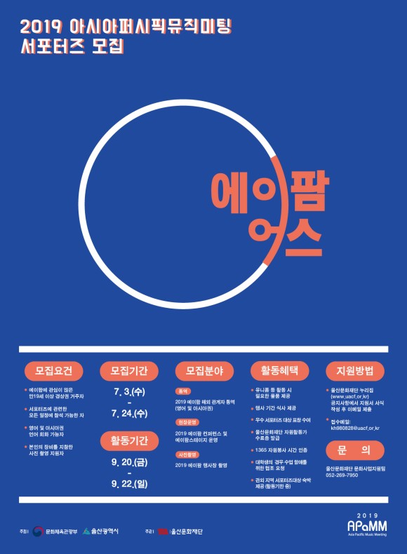 먼저 울산문화재단에서 주최하는 '2019 아시아퍼시픽뮤직미팅' 서포터즈 '에이팜-어스'입니다. '2019 아시아퍼시픽뮤직미팅'은 국내외 음악 산업 관계자들이 울산광역시에 모여 아시아-태평양 지역의 음악 분야 네트워크를 구축하고자 하는 취지에서 개최되는 행사인데요. 이곳에서 서포터즈 '에어팜-어스'가 통역, 현장운영, 사진촬영 총 3개 분야에서 활동하게 됩니다. 활동 기간은 9월 20일(금)부터 9월 22일(일)까지로 학기 중이지만 주말을 포함한 3일이라서 꼭 휴학생이 아니라도 참여할 수 있는데요. 지원 방법은 지원서 작성 후 이메일(kh980828@uacf.or.kr)로 제출해주시면 됩니다.