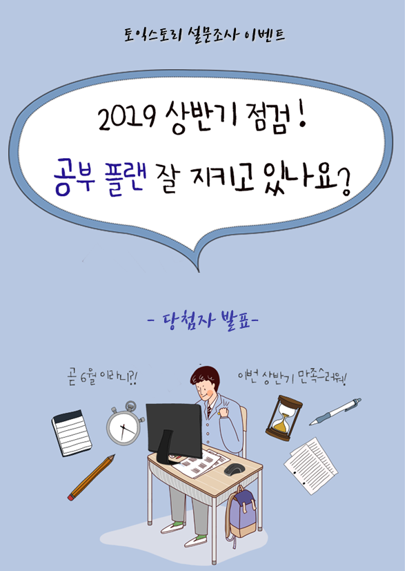 | [설문 이벤트] 2019 상반기 점검! 공부 플랜 잘 지키고 있나요? (0) | 2019.05.21 |