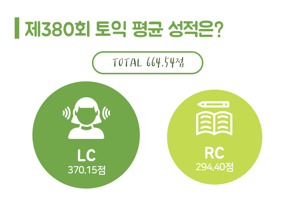 먼저 380회 평균 성적은 664.54점으로 지난 5월 12일 시험보다 13.57점 하락하였는데요. 부문별로 보면 LC 평균 점수는 370.15점, RC는 294.40점으로 지난 379회보다 각각 5.37점, 8.2점 떨어졌습니다.