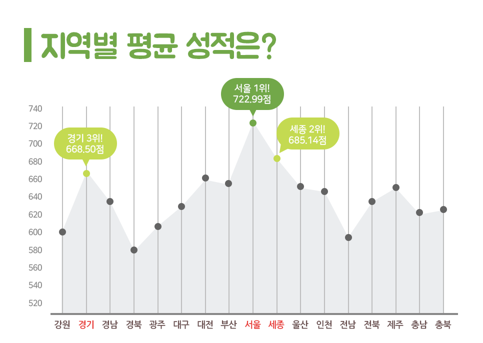 변함없는 1위! '서울'이 이번 회차에서도 지역별 평균 성적 1위를 차지했는데요. 아쉽게도 평균 성적은 722.99점으로 지난 시험보다 12.23점 하락했습니다. 2회차 연달아 2, 3위 지역이 바뀌고 있는 점이 눈에 띄는데요! 이번 회차에서는 '세종'이 685.14점으로 2위를, '경기'가 668.50점으로 3위를 차지했습니다. 지난 회차 2위가 669.43점이었던 것을 비교하면 이번 회차 2위 점수는 15.71점이나 상승했네요!