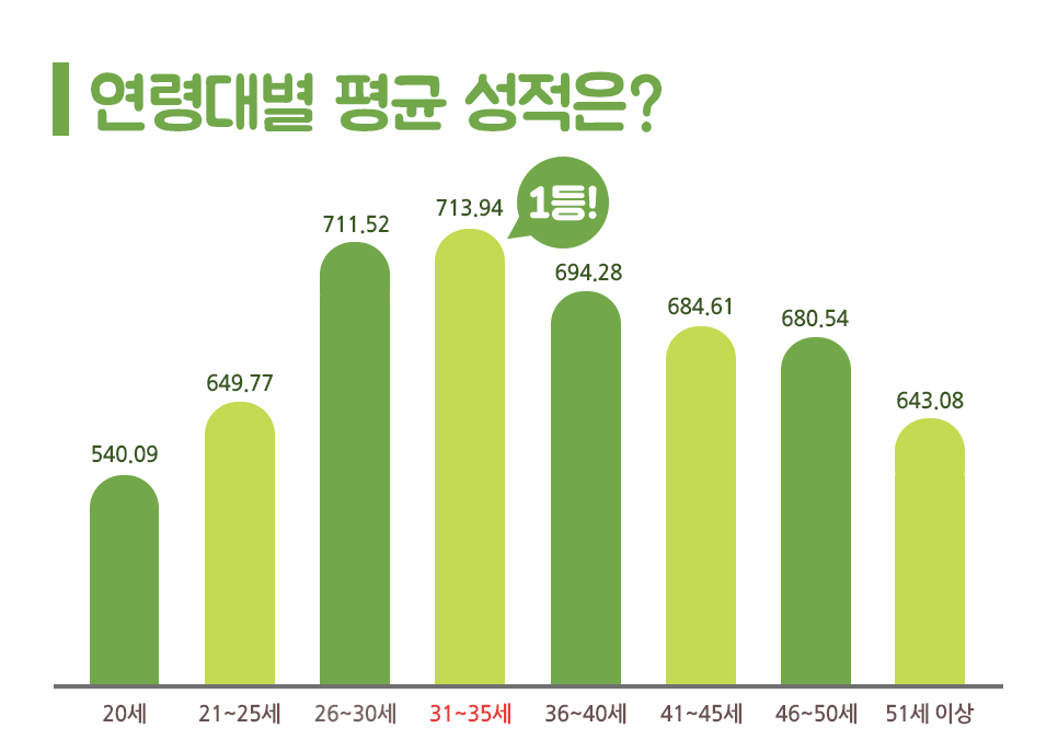 31~35세가 713.94점으로 연령대별 평균 성적 1위를 차지했습니다. 26~30세는 1위와 2.42점 차이인 711.52점으로 2위에 머물렀습니다. 매회 26~30세와 31~35세가 번갈아 1위를 지키고 있네요! 이어 36~40세가 694.28점으로 3위, 41~45세가 684.61점으로 4위를 차지했습니다. 다음은 성별(남/여) 평균 성적입니다.