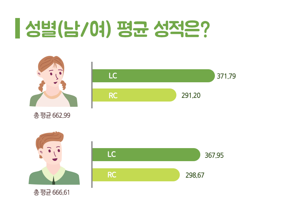 380회 토익에서 여성의 평균 성적은 662.99점으로 지난 회차보다 18.74점, 남성의 평균 성적은 666.61점으로 7.02점 하락하였습니다. 이번 회차를 포함하여 연속으로 세 차례 남녀의 평균 성적 차이가 줄더니 드디어! 이번 회차에서 남성의 평균 성적이 여성의 평균 성적보다 3.62점 높았습니다.