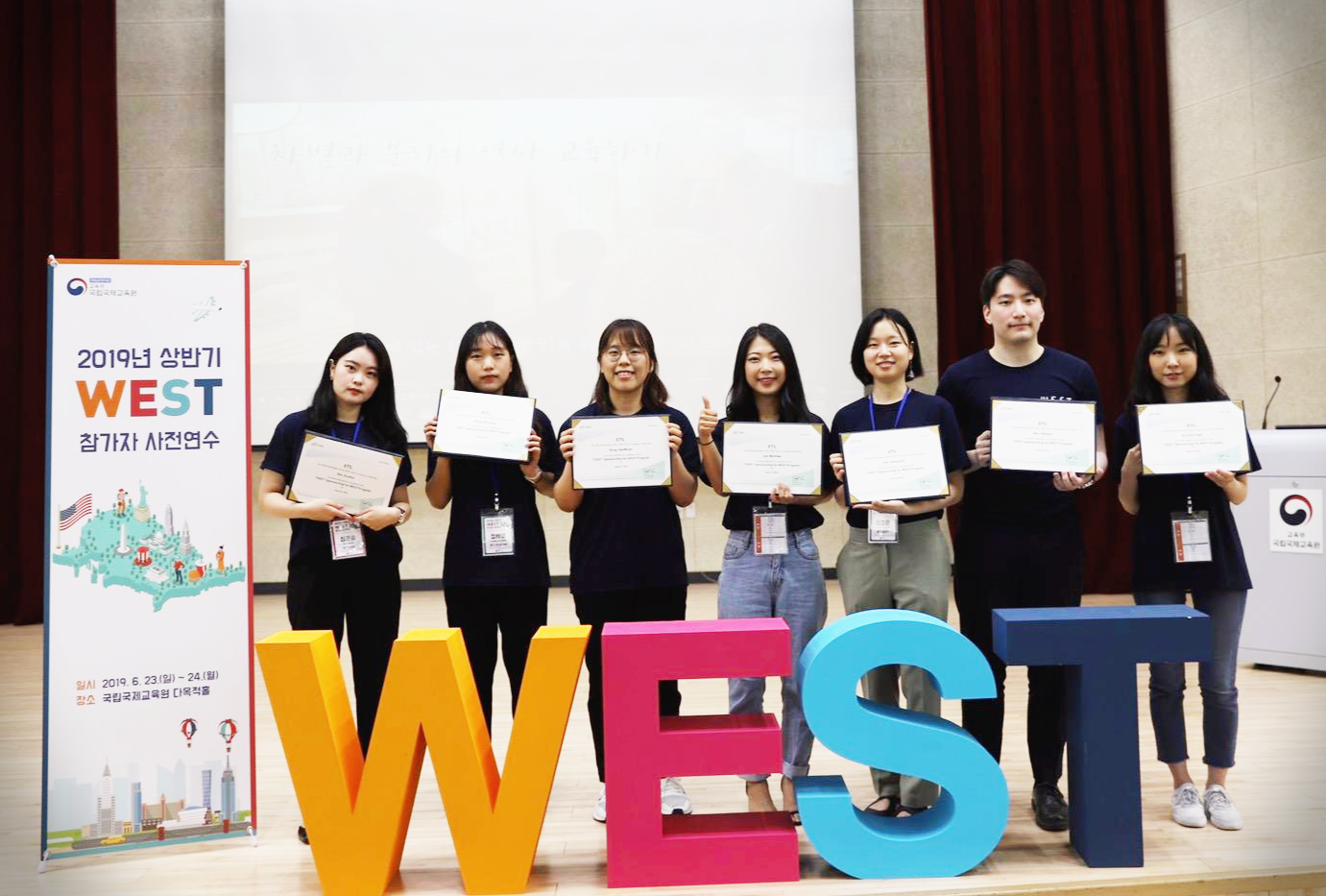 국립국제교육원에 WEST라고 적힌 남색 티셔츠를 입은 학생들로 가득한데요. '2019년 상반기 WEST 프로그램'에 합격한 '장기(18개월)', '중기(12개월)' 웨스티들이 오리엔테이션을 위해 한 곳에 모였기 때문입니다.