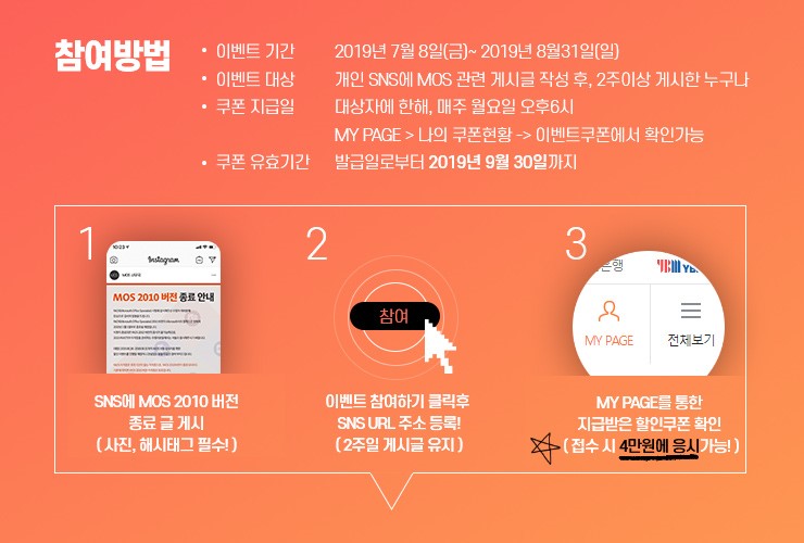 더 많은 할인 혜택을 받고 싶다면 두번째 소개해드릴 'SNS 공유 이벤트'에 주목해주세요! 참여방법은 MOS 2010 종료 안내를 알리는 사진을 캡처하여 필수 해시태그와 함께 개인 SNS에 2주간 게시하면 되는데요. 1회 한정하여 모든 버전의 MOS 시험 39,000원 할인 쿠폰이 주어집니다.