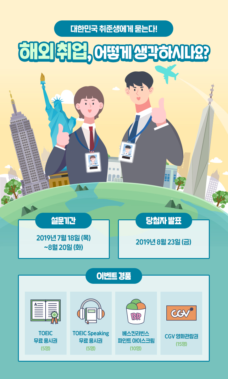 취업난이 계속되면서 해외로 눈을 돌리는 취준생들이 늘고 있습니다. 하지만 언어, 문화적 차이 등의 어려움 때문에 마냥 긍정적으로 볼 수는 없는 상황인데요. 과연 대한민국 취준생들은 해외 취업에 대해 어떻게 생각할까요? 여러분의 의견을 듣고자 <토익스토리>가 설문조사 이벤트를 준비했습니다.