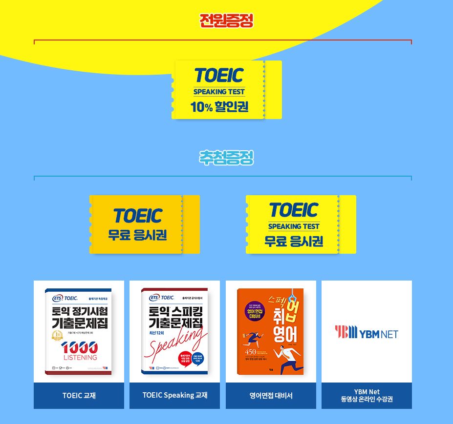 이밖에 본 행사에 참여하는 모든 분들에게 TOEIC Speaking 응시료 10% 할인권을, 추첨을 통해 TOEIC, TOEIC Speaking 무료 응시권, 각종 교재와 YBM Net 동영상 온라인 수강권을 증정한다고 하니 놓치지 마세요!