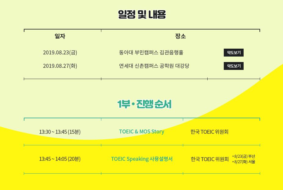 내용을 한 번 살펴볼까요? 취업콘서트는 크게 1부와 2부로 나뉘는데요. 1부는 YBM 한국TOEIC위원회에서 준비한 시간입니다. 이 시간을 통해 취준생들의 관심사이자 취업 과정에 유용하게 쓰이는 TOEIC과 MOS를 알 수 있는데요. 평소 TOEIC, TOEIC Speaking, MOS에 관심 있는 수험자라면 꼭 참석해 보세요.