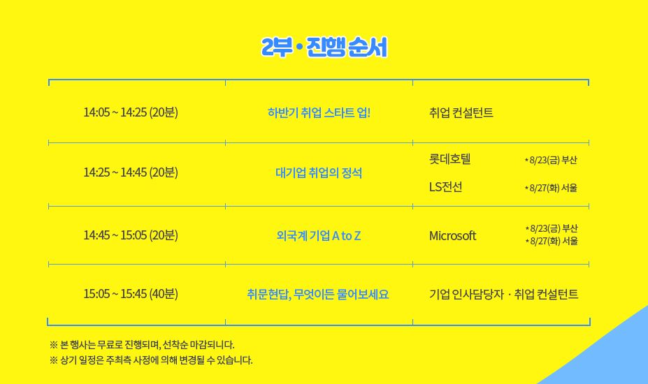 다음은 취업콘서트의 하이라이트라고 할 수 있는 2부입니다. 유명 취업컨설턴트가 알려주는 하반기 채용 동향을 시작으로 롯데호텔, LS전선, 마이크로소프트 대기업 인사담당자들이 나와 대기업 취업의 정석과 외국계 기업 A to Z라는 이름으로 취업 꿀팁을 전할 예정인데요. 이 밖에 참석자들과 기업 인사담당자, 취업컨설턴트가 자유롭게 질문하고 답할 수 있는 질의응답 시간도 마련돼 있습니다.