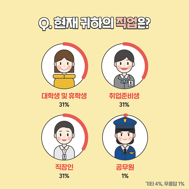 먼저 응시자들의 직업입니다. ‘대학생 및 휴학생’, ‘취업준비생’, ‘직장인’의 비율이 모두 31%으로 공동 1위를 차지했습니다. 토익스피킹 시험이 학생에만 국한되는 것이 아니라 직장인들도 많이 보는 시험인 것을 알 수 있는 결과이기도 한데요.
