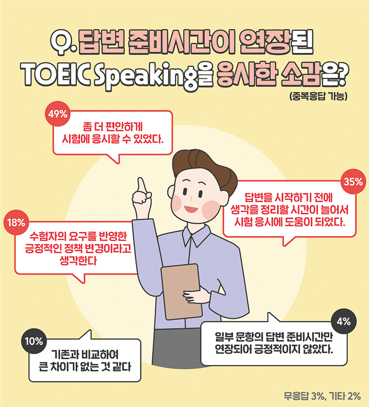 답변 준비시간이 연장된 시험을 응시한 소감도 들어봤는데요. '좀 더 편안하게 시험에 응시할 수 있었다'가 49%로 1위, '답변을 시작하기 전에 생각을 정리할 시간이 늘어서 시험 응시에 도움이 되었다'가 35%로 2위, '수험자의 요구를 반영한 긍정적인 정책 변경이라고 생각한다'가 18%로 3위를 기록했습니다.