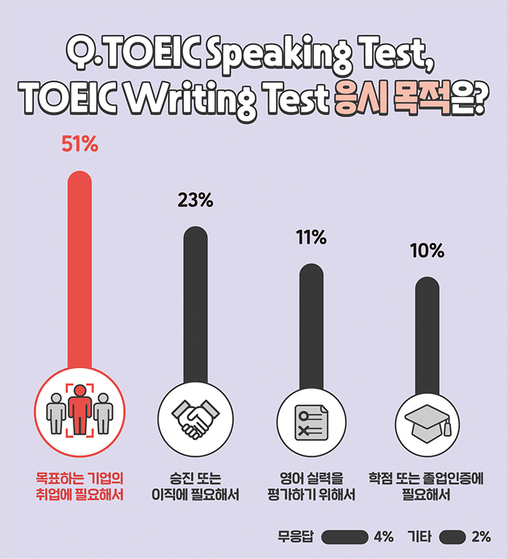 응시자들의 토익스피킹, 토익라이팅 응시 목적도 이번 설문조사에서 살펴봤는데요. 설문조사 결과, ‘목표하는 기업의 취업에 필요해서’가 51%로 가장 높았고 ‘승진 또는 이직에 필요해서’가 23%로 그 뒤를 이었습니다. 직장과 관련된 항목들이 상위권을 차지하였네요!
