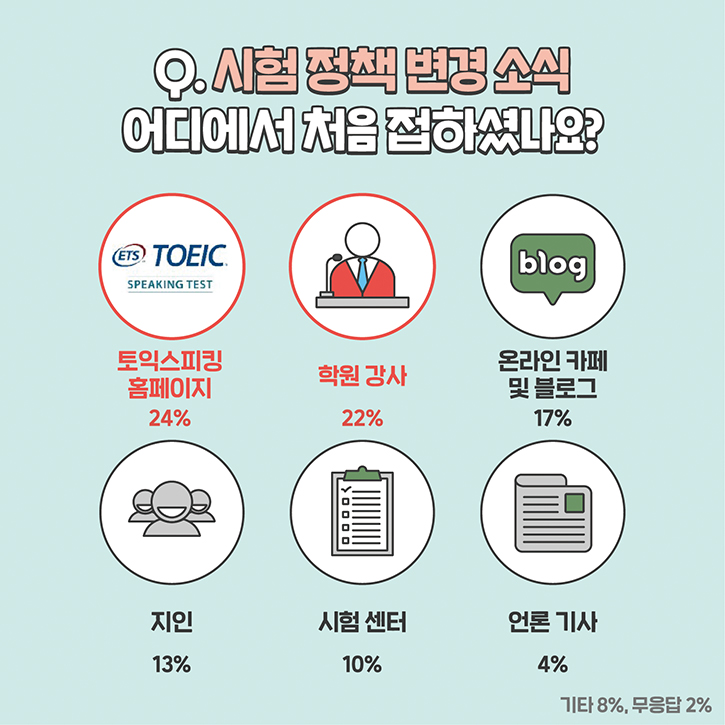 그렇다면 응시자들은 TOEIC Speaking and Writing Tests 시험 규정 및 정책 변경 소식을 어디서 접했을까요~? 설문조사 결과, '토익스피킹 홈페이지'가 24%로 가장 높았습니다. 2% 차이로 '학원 강사'(22%)가 2위를 차지했고요. ‘온라인 카페 및 블로그’가 17%로 그 뒤를 이었습니다.