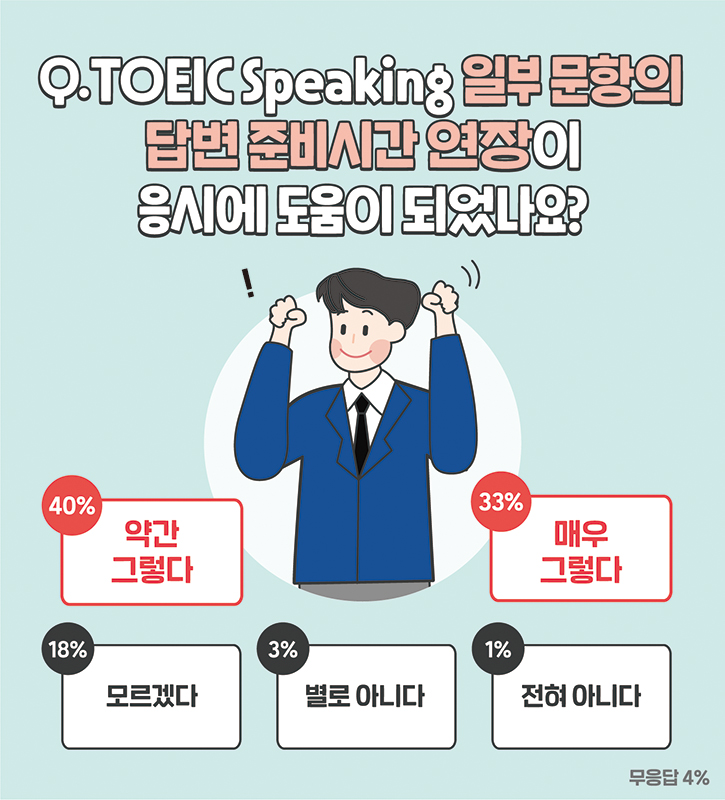 두 번째 변경사항이었던 ‘답변 준비시간 연장’에 대한 의견도 들어봤습니다! ‘답변 준비시간 연장이 시험에 도움이 되었나요?’라는 질문에 ‘약간 그렇다’가 40%, ‘매우 그렇다’가 33%를 차지하며 응시자의 73%가 만족감을 드러냈습니다.