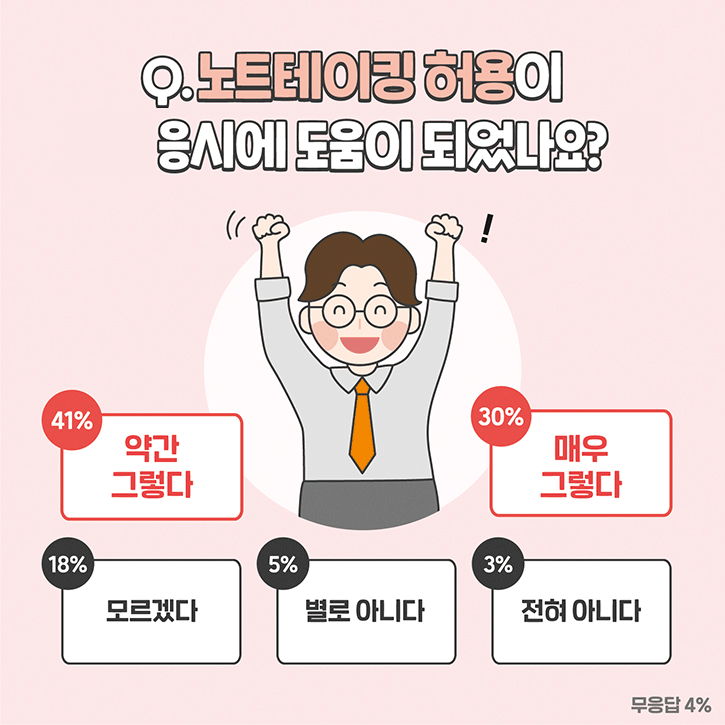 노트테이킹을 하면서 응시한 소감에 대해서는 ‘좀 더 편안하게 시험에 응시할 수 있었다’가 47%, ‘시험 중 답변하는 과정에서 주요 정보를 놓치는 실수를 줄일 수 있었다’가 24%로 1, 2위를 선점했습니다. 2위와 2% 차이로 '수험자의 요구를 반영한 긍정적인 정책 변경이라고 생각한다'(22%)가 3위를 기록했고요. ‘노트 테이킹 허용’에 대해서 만족하는 반응이 상위권을 차지하고 있는데요!
