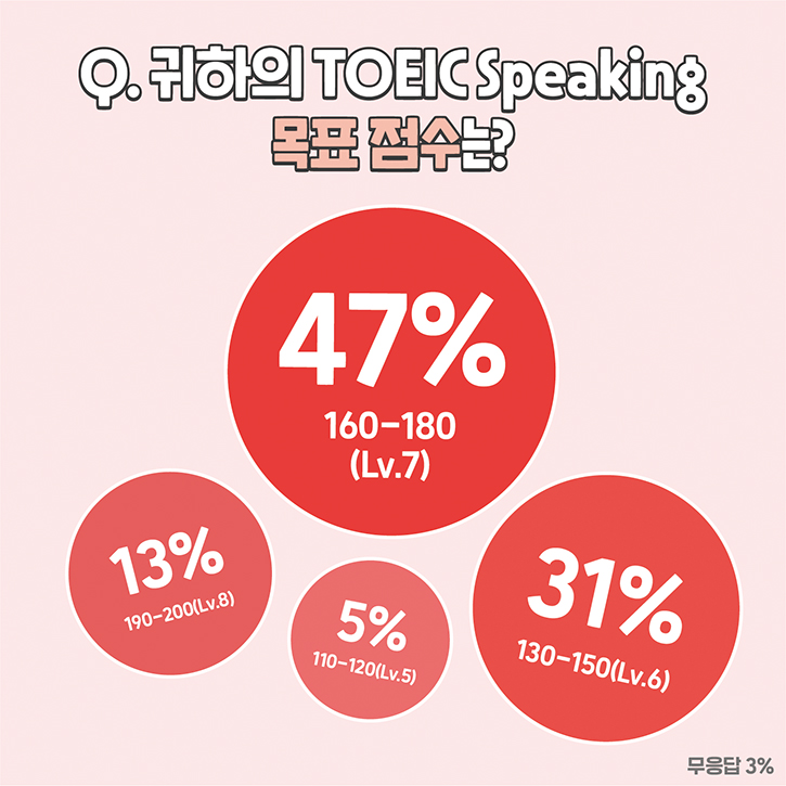 마지막으로 응시자들의 TOEIC Speaking 목표 점수를 알아보겠습니다. ‘160-180점(Lv.7)’이 47%로 1위, 기업들의 평균 토익스피킹 기준 점수인 ‘130-150점(Lv.6)’은 31%로 2위를 차지했는데요! 일반 지원자들과 차별점을 원하다 보니 ‘160-180점(L.v.7)’이 1위로 나온 것으로 추측됩니다.