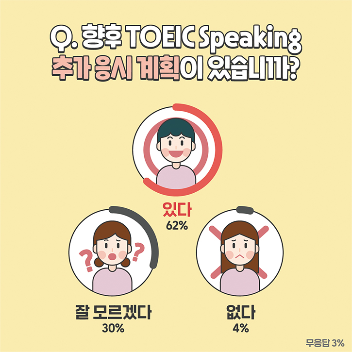 '향후 TOEIC Speaking 추가 응시 계획이 있습니까?'라는 질문에는 응시자의 절반 이상인 62%가 추가 응시 계획이 있다고 밝혔는데요. TOEIC Speaking 시험에 대한 응시자들의 뜨거운 관심을 엿볼 수 있었습니다.