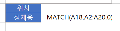 직원 명부에서 ‘정채용’ 사원이 이름 데이터 중에 몇 번째에 있는지를 match 함수를 사용하여 찾아보겠습니다.