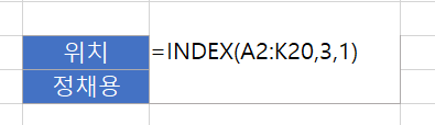2. =Index(A2:K20,3,1)을 입력하고 Enter를 누릅니다.