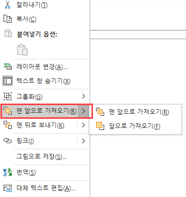 2. 그림에 마우스를 가져가서 마우스 오른쪽 버튼을 클릭하고 단축메뉴 > [맨 앞으로 가져오기] 또는 [맨 뒤로 보내기]를 클릭합니다.