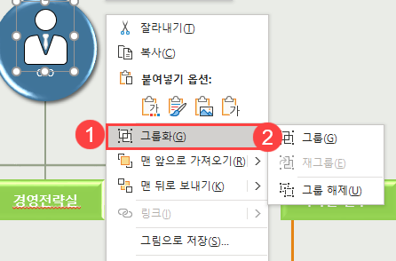 그룹화란 여러 개의 개체를 하나의 개체로 묶는 것을 말합니다. 그룹화를 하면 한 번에 도형 서식을 적용하거나 크기를 조정할 수 있습니다. 조직도 상단의 CEO 그림과 직사각형 배경을 하나의 개체로 그룹화하겠습니다.